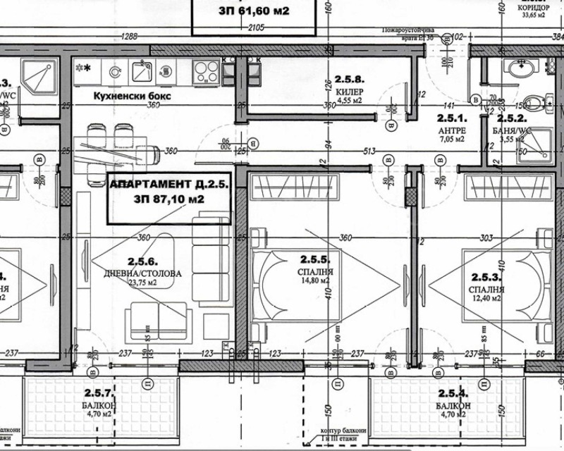 Имотът е с площ от 99,82 кв.м с включени общи части и функционално разпределение всекидневна с кухненски бокс, две спални, две бани, антре и тераса. Отоплението е предвидено на газ.