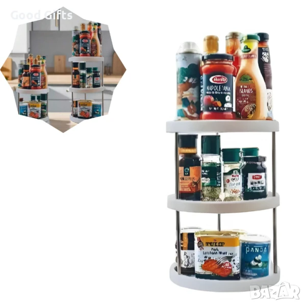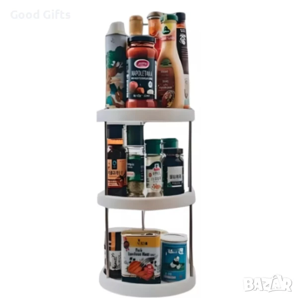 Подреди кухнята си стилно и удобно с тази въртяща се стойка с 3 нива, която ти осигурява бърз достъп до всичко необходимо само с едно завъртане! Независимо дали я използваш за подправки, сосове, консерви или козметика, тази стойка ще спести място и ще внесе ред във всяко помещение.