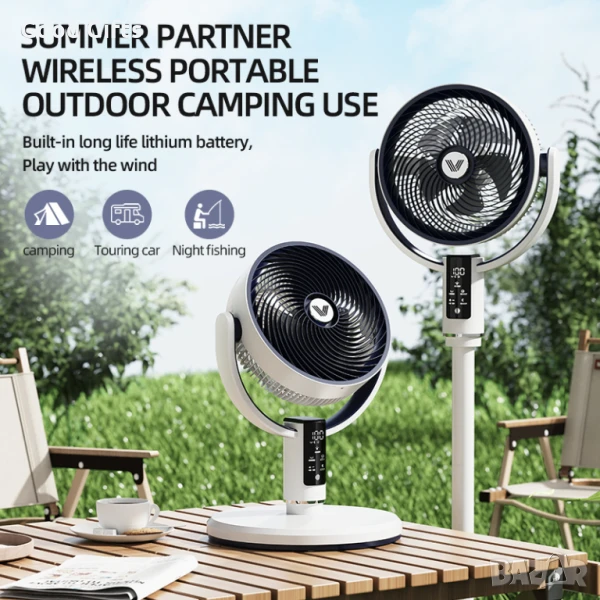 Мощна презареждаща се батерия 8000 mAh: Вентилаторът може да работи безжично, което го прави отличен за къмпинг, балкон или при липса на ток.