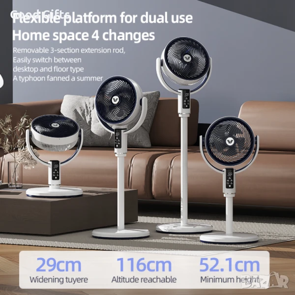 Регулируема височина: Подвижната стойка позволява да настроите вентилатора като настолен или стоящ според нуждите ви.
