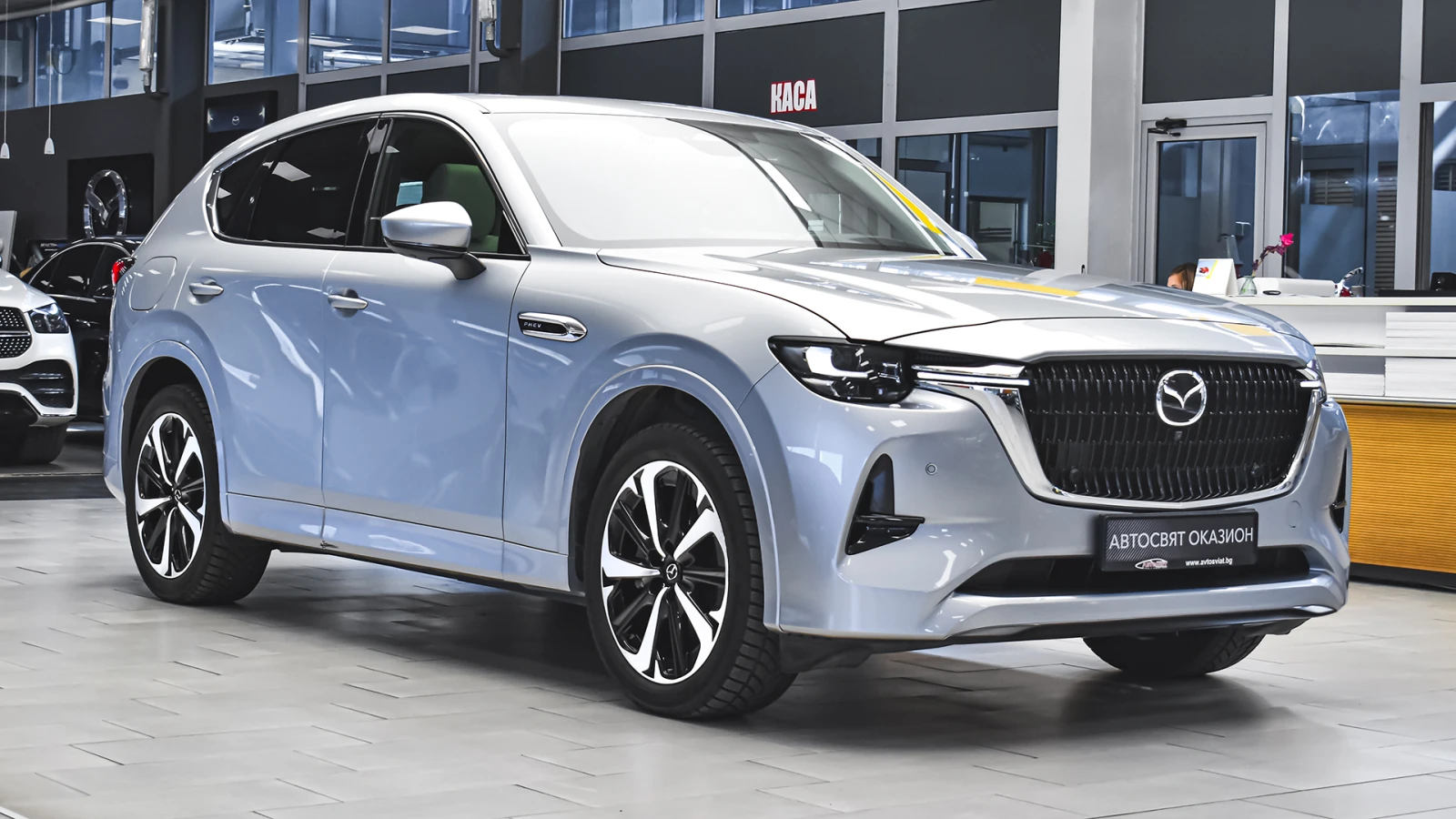 Автосвят ООД - официален представител на Opel и Mazda, предлага на Вашето внимание клиентски автомобил Mazda CX-60 2. 5 e-SKYACTIV PHEV TAKUMI 4x4 Automatic Допълнителни услуги: - лизинг; - сътрудничество при регистрация; - възможност за обратно изкупуване; - посредничество при застраховане; - посредничество при завеждане на щети при застрахователя. Цвят - Sonic Silver Metallic Пробег с едно зареждане на батерията 60 км. (WLTP) Капацитет на батерията 17. 8 kWh Пакет Комфорт - COMFORT (COM-P) Регулируемо предно външно огледало с памет Електрическа седалка (водач 8 направления+опора за кръста): 10 направления Електрическа седалка (пътник 8 направления+опора за кръста): 10 направления Отопление на задните седалки Предни вентилирани седалки Мониторинг на водача с персонална идентификация Запаметяване на позицията за шофиране чрез разпознаване на лица (седалка/HUD/предно външно огледало) Система за мониторинг на пасажерите Пакет Асистент на водача - DRIVER ASSISTANT (DRI-P) Адаптивен LED матрични фарове (20 лъча на фар) Предупреждение за пресичащи отпред автомобили (FCTA) Автоматично прилагане на спирачки при пресичащи отзад автомобили (RCTA) (камера за задно виждане с динамични линии) Интелигентна помощ за спиране в градски условия на заден ход (заден SCSB) Радарен круиз контрол на Mazda (MRCC) с помощ при поддържане на скоростта и движението i-адаптивен круиз контрол (i-ACC) Външни огледала - автоматично затъмняване Кристално вътрешно огледало без рамка с автоматично затъмняване Комбинация от характерно затъмнено осветление отпред Пакет Удобство и звук за PHEV - CONVENIENCE & SOUND (CON-P) Електрическа врата на багажника с функция отваряне/затваряне без ръце Затъмнени задни стъкла Монитор за наблюдение на 360 (камерата за задно виждане с динамични линии) с прозрачен изглед AC контакт 220V 150W в купето Ac контакт 220V 1500W в багажника Осветление на задната конзолна кутия Амбиентно осветление на вратите отпред и отзад, осветление в джоба на предните и задните врати Безжично зареждане на мобилен телефон Аудио система Bose с 12 високоговорителя Пакет - PANORAMIC ROOF (PAN-P) Панорамен покрив с плътна щора 20 алуминиеви джанти, черен металик, машинна обработка Предна решетка Piano Black Bar характерен светъл цвят на решетката Дизайнерски предни и задни светлини Японско качество с най-висок клас естествена кожа - бяла напа Осветление под автомобила при отворена врата Амбиентно осветление в краката при задната седалка Хромирани лайсна над страничните стъкла Волан облицован с кожа и ръчно ушит в двутоново черно Електронно регулиране на волана USB (2 отпред, тип C + 2 отзад, тип C) и гнездо 12V (отпред и в багажника) Интелигентно отключване/заключване без ключ Изходи за вентилация за задната седалка Проекционен цветен дисплей върху стъклото пред погледа на водача HUD Амбиентно осветление отпред за краката Осветление на жабката Предна светлина на горната конзола Нагреватели в предното стъкло за размразяване в зоната на чистачките Подгряване на волана Подгряване на предните седалки LED фарове с устойчивост за измиване Kodo дизайн LED мигачи Предни LED дневни светлини Странични огледала с интегрирани LED мигачи Странични огледала - в цвета на купето Задни комбинирани светлини - LED Заден спойлер Странични огледала - електрически регулируеми, с отопление, автоматично сгъване Вградена антена в задното стъкло Скрити предни чистачки с интегрирана миеща дюза в рамото на чистачката 12