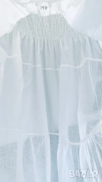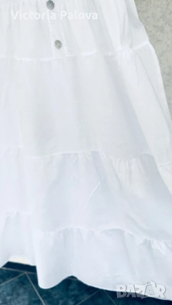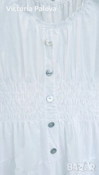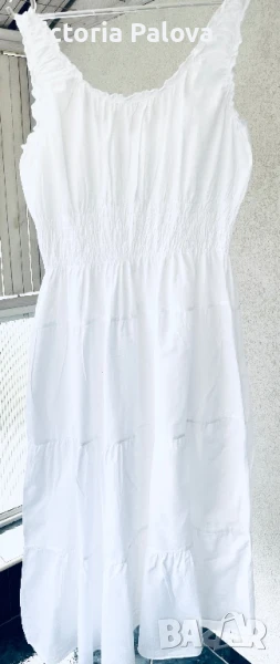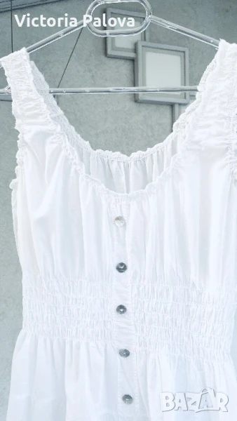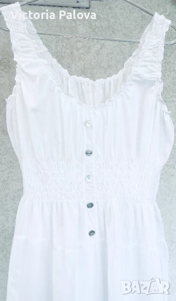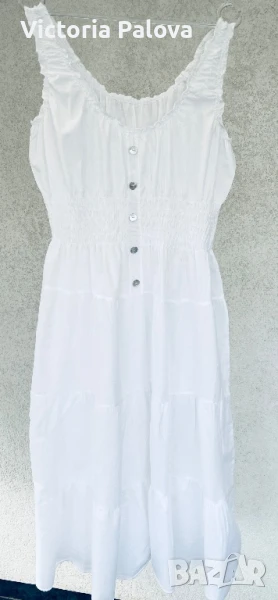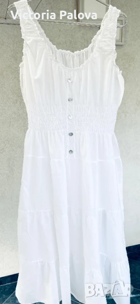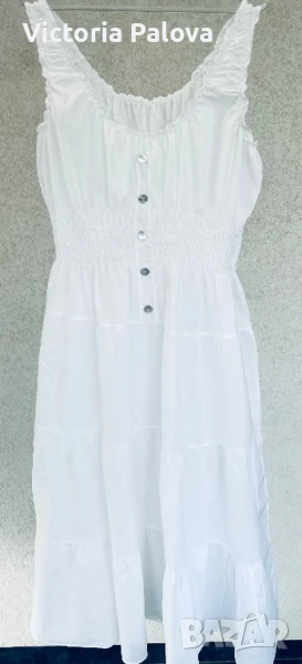 Прекрасна рокля за море, тънък нежен памук, лека и безтегловна, с нежни ластички в талията и презрамки, разтеглива, красиви седефени копчета. ГО - 46-60см, талия -ластици - 38-52см, ханш - 73см, дължина - 116см.