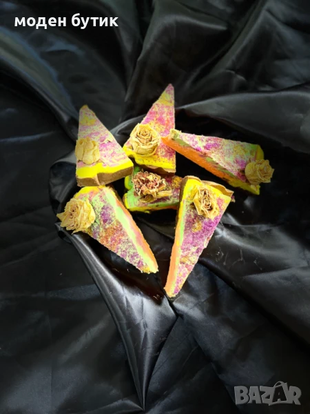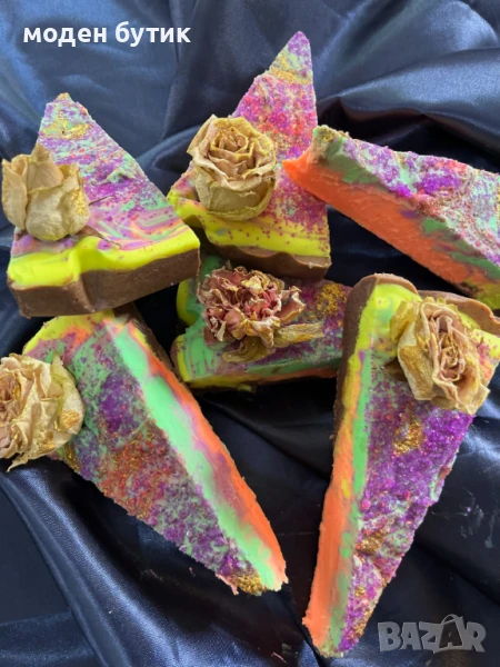 Арт сапун със сочна визия на неустоим десерт, но без грам калории. Долният слой е богат на натурално какао, а горният се вихри в swirl от ванилово бяло, фуксия и жълто, гарниран с рози и храна за въображението. Ароматът е кремообразен и сладък, с доминираща ванилия (80%), допълнена от малинов/розов нюанс - точно като парфюм, който искаш да оближеш.