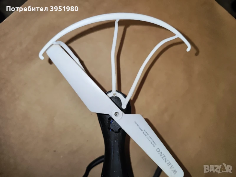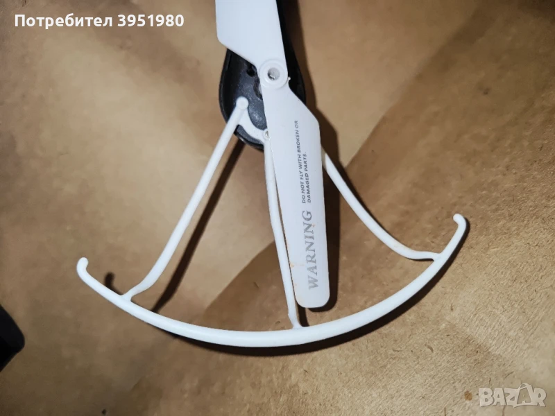 Дронът има два деформирани предпазители на перките и е без кабел за зареждане.