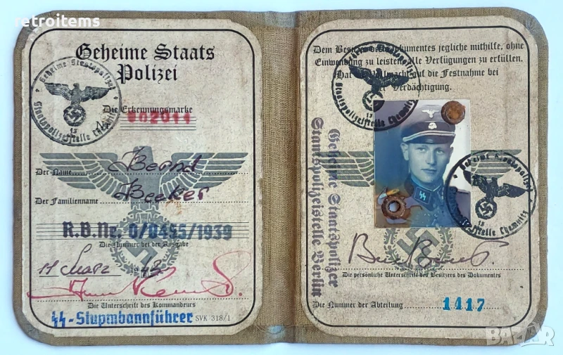 Немски документ от Втората световна война Kripo - Geheime Staats Polizei