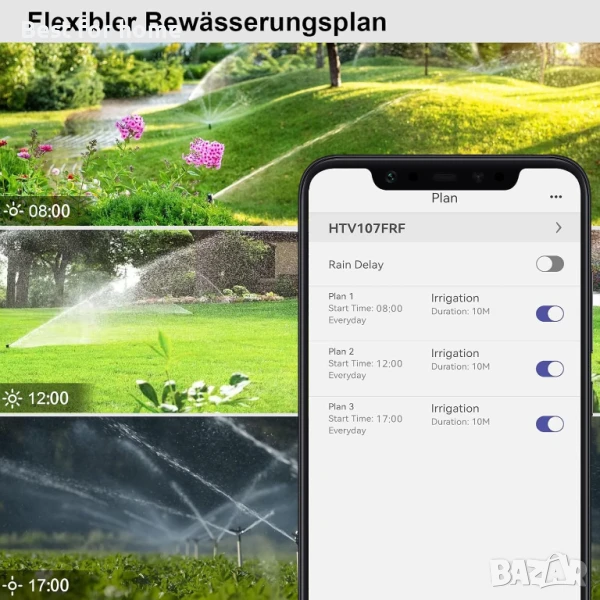 Забавяне в дъждовни дни: интелигентната система за поливане може автоматично да разпознае времето и да забави поливането в дъжд с 24 часа, 48 часа или 72 часа, като ефективно предотвратява преполиването. Освен това, този
