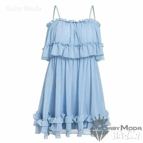 С шев с ластик на талията и набран волан. Тънки, регулиращи презрамки.