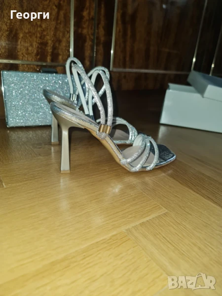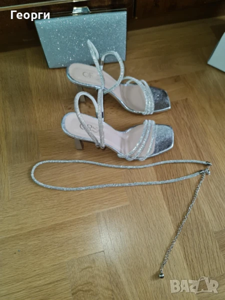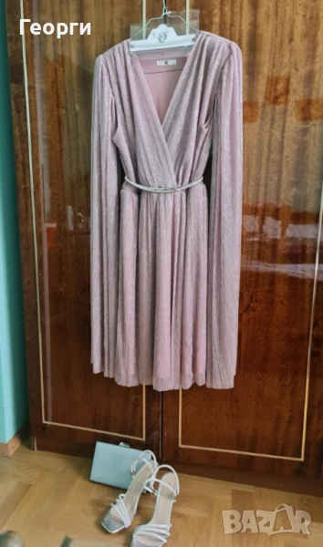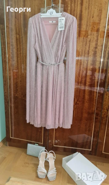 готов комплект: рокля, обувки, дамска чантичка, колие с обеци за официален случай. Всичко е ново, неупотребявано, с етикети. Обувките са български (Пещера), 39 номер. Роклата е цвят пудра. Дължината й от талията е 60 см. Размерите, на които отговаря са 42-44-46, тъй като е с ластик в талията. Продават се заедно. (Цена само за роклята 65 евро)