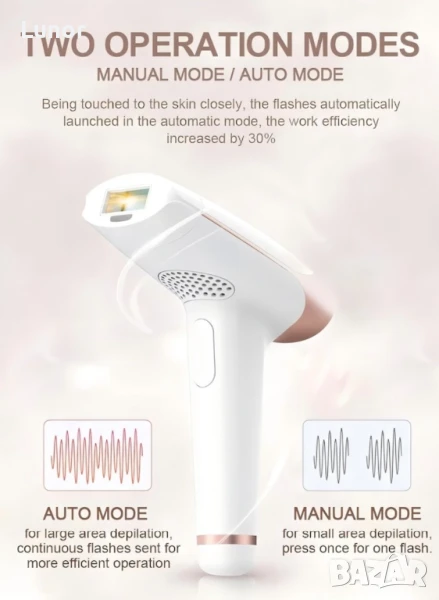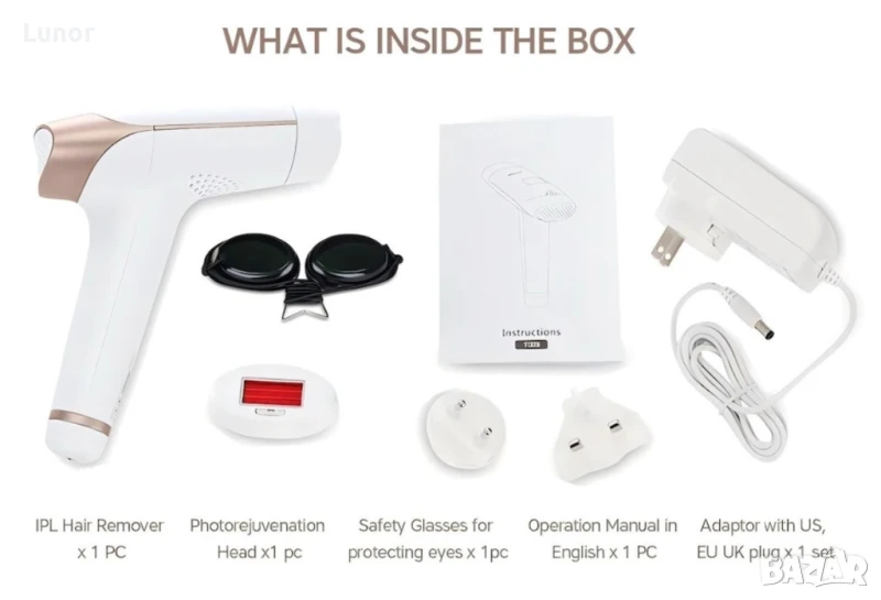 Кварцова лампа с дълъг живот – 300 000 импулса за епилация и 100 000 за фотоподмладяване.
