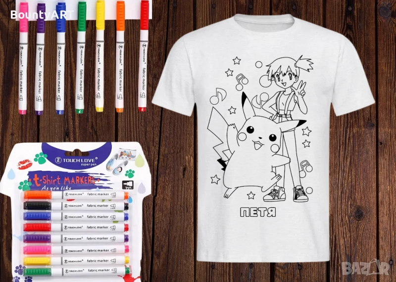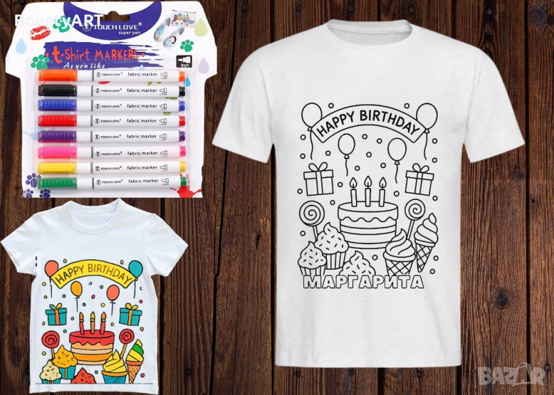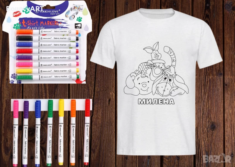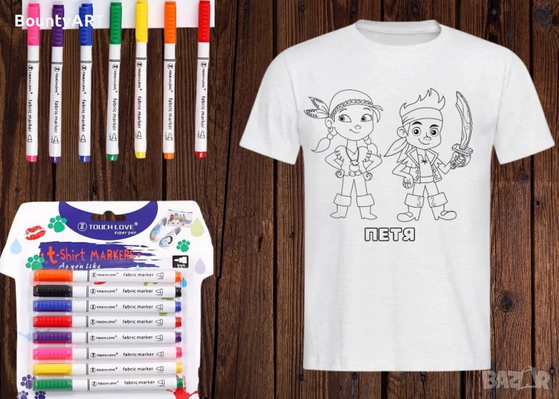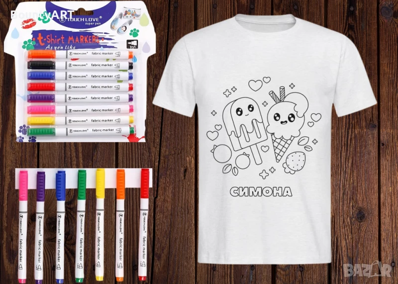 Новият ни комплект за оцветяване е тук- Персонализирана тениска с Името на детето + цветни флумастери за текстил.