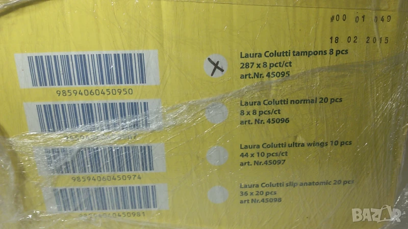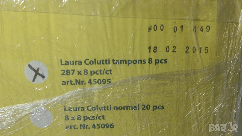 Кашон с неотваряни кутии, около 280 на брой, всяка с 8 тампона. Общо е имало 287 кутии, липстват около 6-7.