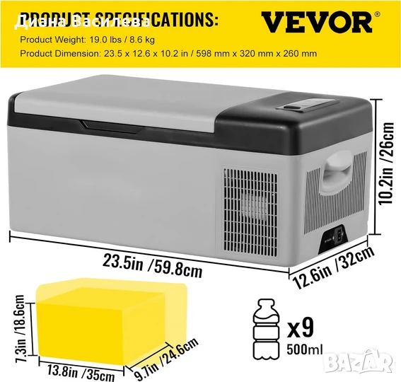 Продавам нов преносим хладилник с компресор VEVOR. 15 литра който ще ви позволи да запазите храната и напитките си както охладени, така и замразени докато пътувате на по-дълги маршрути. . Подходящ за автомобил, камион, пикник, къмпинг, лодка или къдетo ви потрябва. Работи на 12v 24v и 220v.Обем от 15 литра.