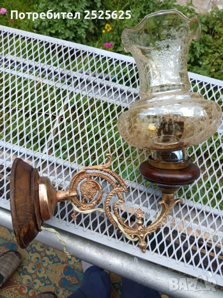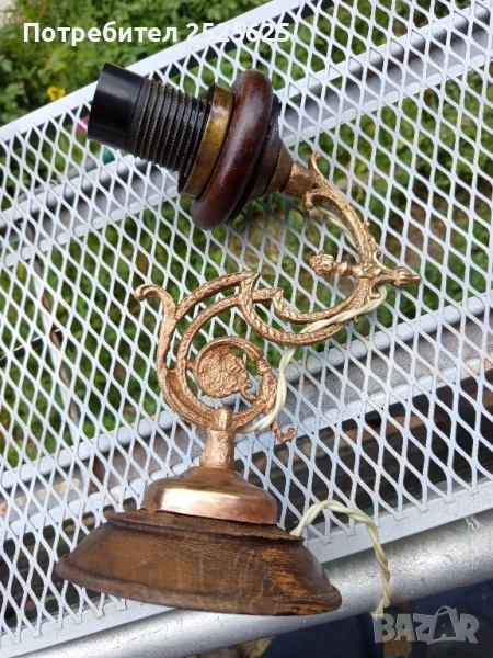 Стара, реновирана лампа, бронз и дърво. оригинален е малкия плафон, големия е допълнително бонус. Свързва се към Ел. с устерклема, допълнително съм поставил кабел с щепсел за контактна връзка по избор.