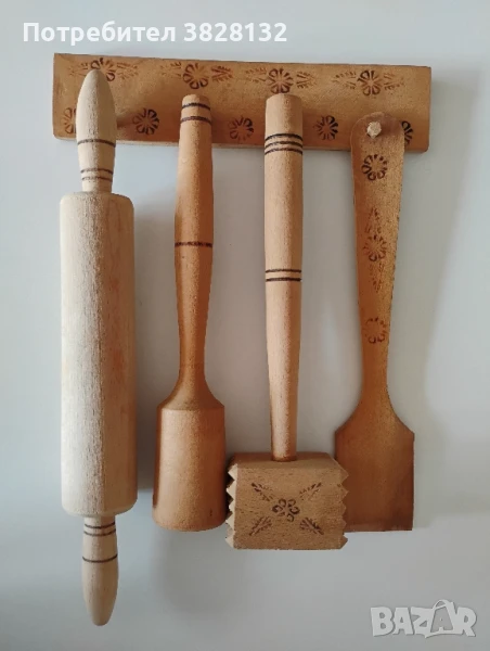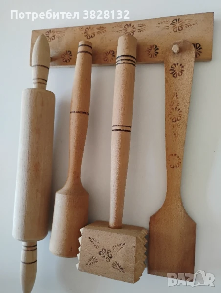 стар комплект кухненски инструменти, от СССР, дървени, бук, неизползвани, имат и закачалка за стена.