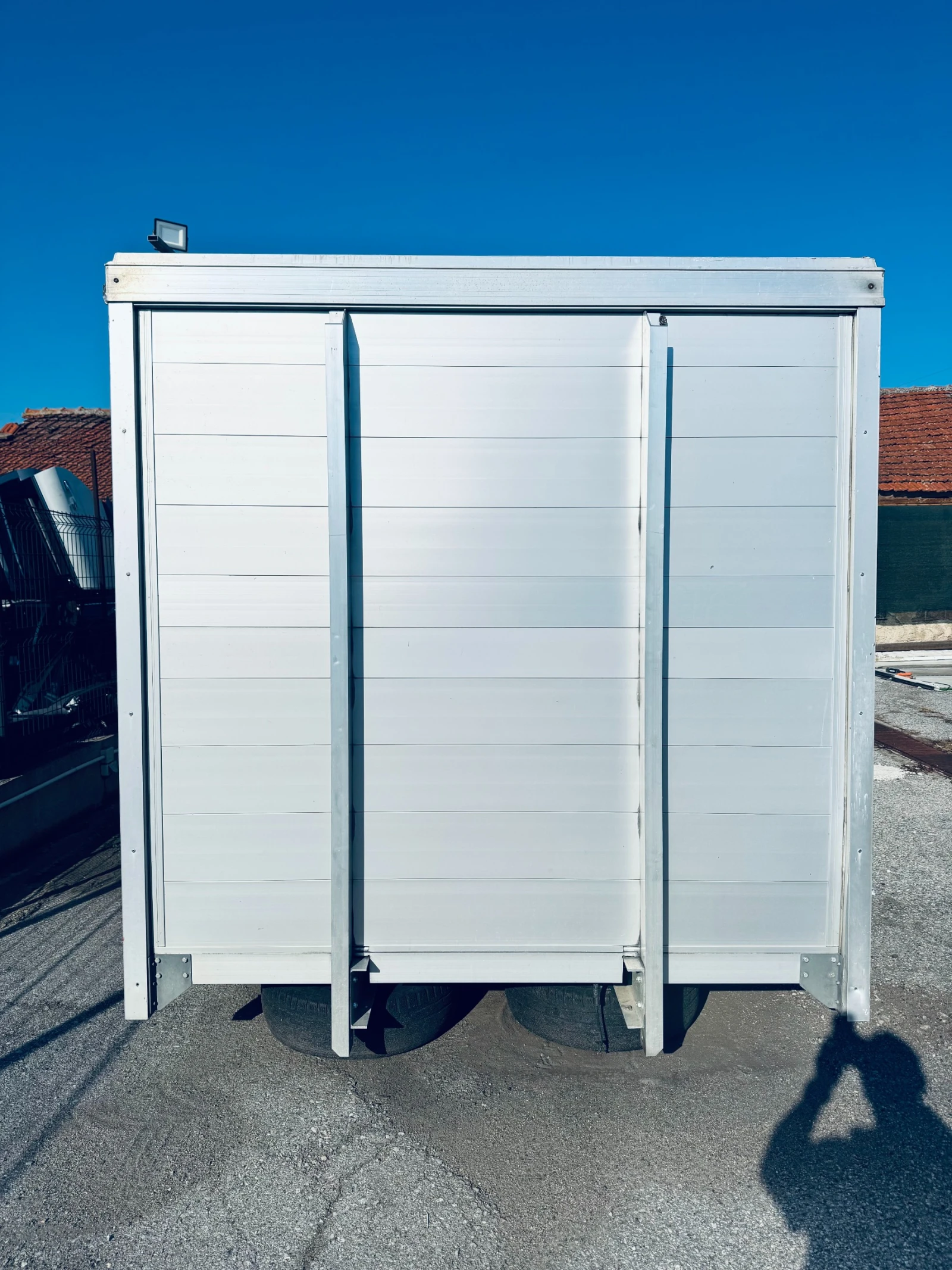 Алуминиев куфар с ролетни щори и тристранно отваряне , размери: дължина 3. 90м. ширина 2. 09м. височина 2. 10м.