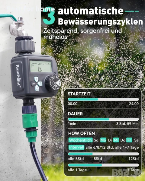 [Гъвкаво поливане]: Таймерът за вода RAINPOINT предоставя по-гъвкав начин за контрол на поливането от всякога. Независимо дали предпочитате да поливате всяка сутрин, следобед или вечер, или в определени дни от седмицата, той може да отговори на вашите нужди.