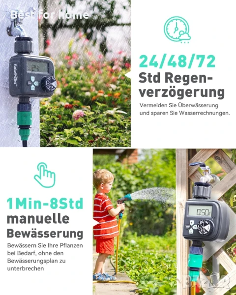 [Забавяне при дъжд и ръчно поливане]: Този компютър за поливане има функция за забавяне при дъжд от 24/48/72 часа. Когато е активиран, той пропуска предварително зададения график за поливане, за да предотврати преполиване, и след това се възобновява автоматично. Можете също да използвате бутона за ръчно поливане, за да започнете поливането незабавно (от 1 минута до 8 часа), без да прекъсвате графика за поливане.