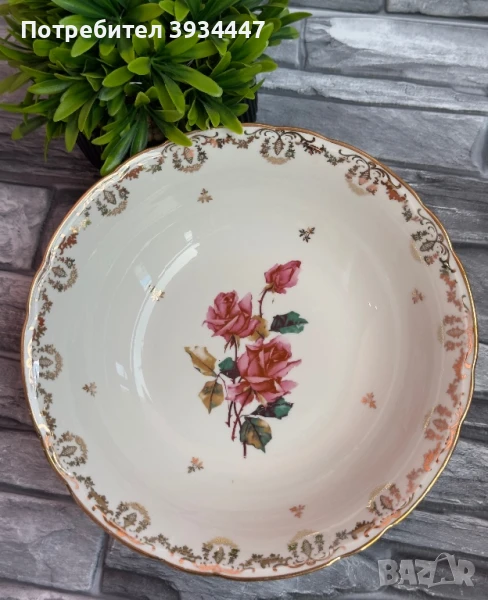 Купа за салата достойна за витрина.Аристократични червени рози върху порцелан слонова кост и много златни орнаменти,дори и от долната и страна.Украсена е с нежни златни цветчета.