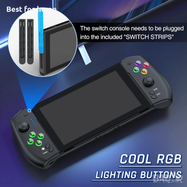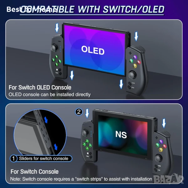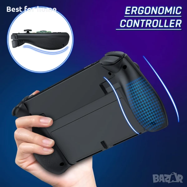 【Иновативен дизайн на контролер за Nintendo Switch/OLED】Този безжичен контролер е с иновативен дизайн, базиран на кабелния еднокомпонентен джойпад. С Bluetooth за безжична връзка вече не се притеснявайте, че не можете да се свържете с контролера. Разполага с рамка за свързване на гърба, дизайнът ефективно увеличава сцеплението на левия и десния контролер (Забележка: Конзолата Nintendo Switch трябва да бъде поставена предварително, за да пасне на размера на включената "Switch лента", моля, не я губете).