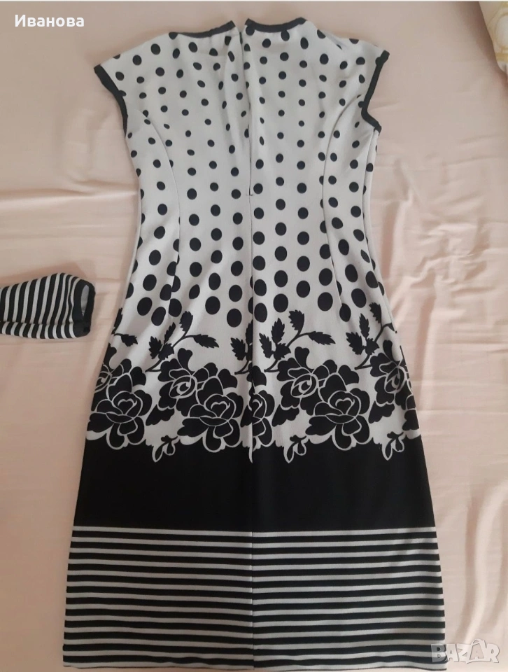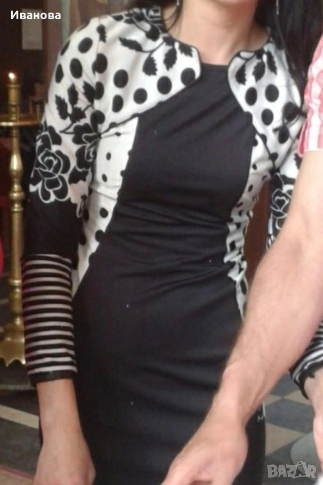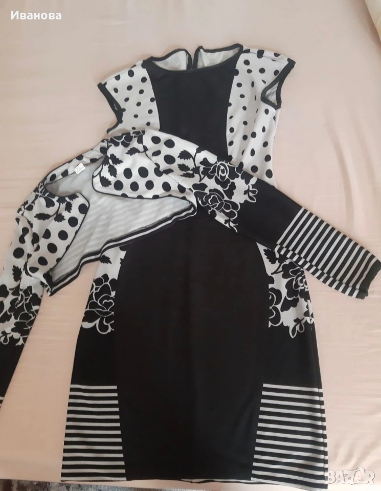 Костюмчето е обличано 2-3 пъти само за повод и е без забележки. Рокличка с болеро към нея, БГ производство. Стои много елегантно. Черно-бяла гама. Размер С/М, но давам някои приблизителни мерки /с лека разтегливост/. Полиестер и памук.