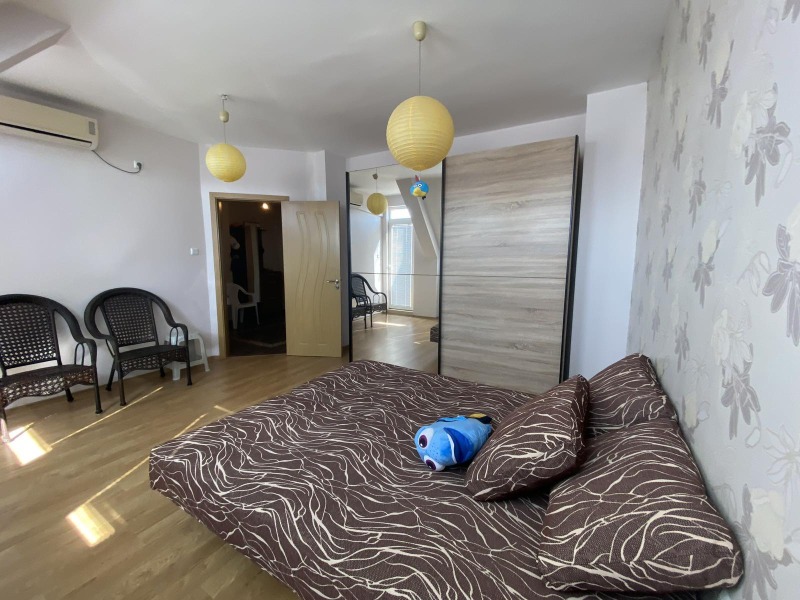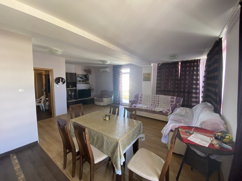 Предлагаме ви един просторен, стилно обзаведен тристаен апартамент в жилищна сграда ново строителство, разположена в централната част на гр. Поморие, зад Общината, до Софарма на 200 метра от централната пешеходна улица и на 100 метра от плажа. Жилището се намира на 6-ти последен етаж, единствен апартамент на етажа, целогодишно работещ асансьор. Има обща застроена площ от 137.08 кв.м и се предлага напълно обзаведено и оборудвано с мебели и техника. Състои се от преддверие, баня с тоалетна, една голяма (основна спалня) с излаз на тераса, втора просторна спалня и много просторна всекидневна с кухненски бокс, отново с излас към тераса, баня с тоалетна и отделно мокро помещение. Изложението е изток-север-запад. Има инсталирани климатици във всички стаи. Подходящ както за целогодишно, така и за сезонно ползване. Акт 16. Отделни партиди за вода и електричество по битови тарифи.