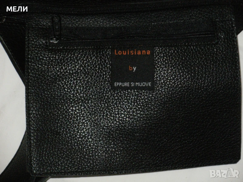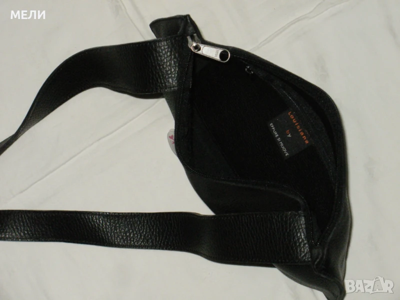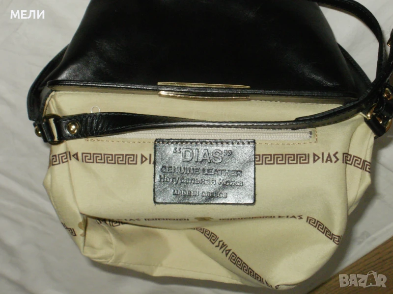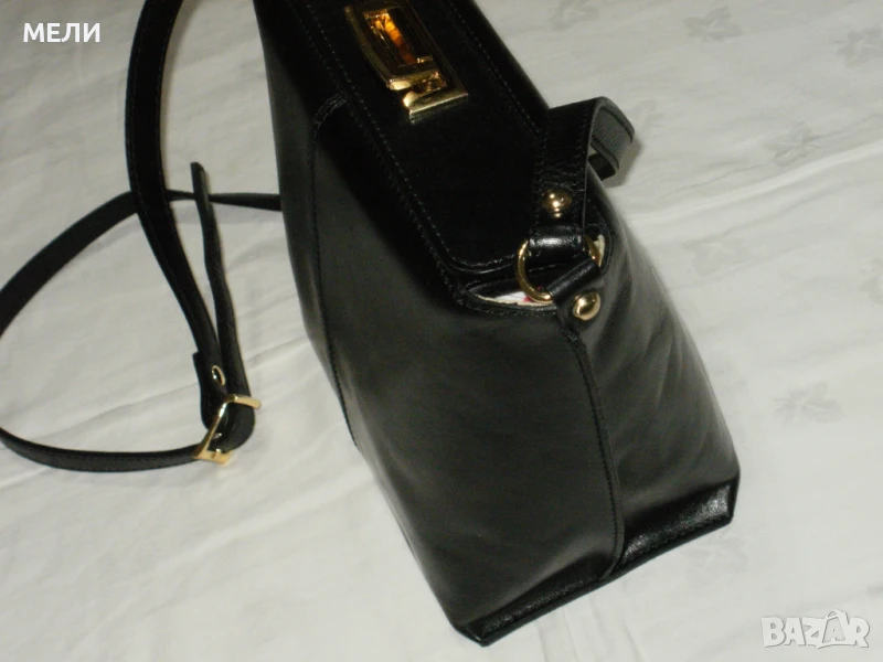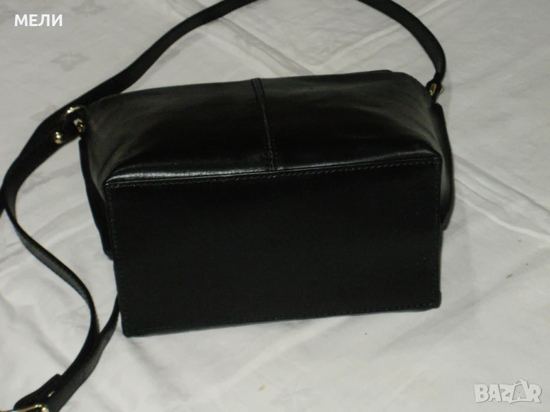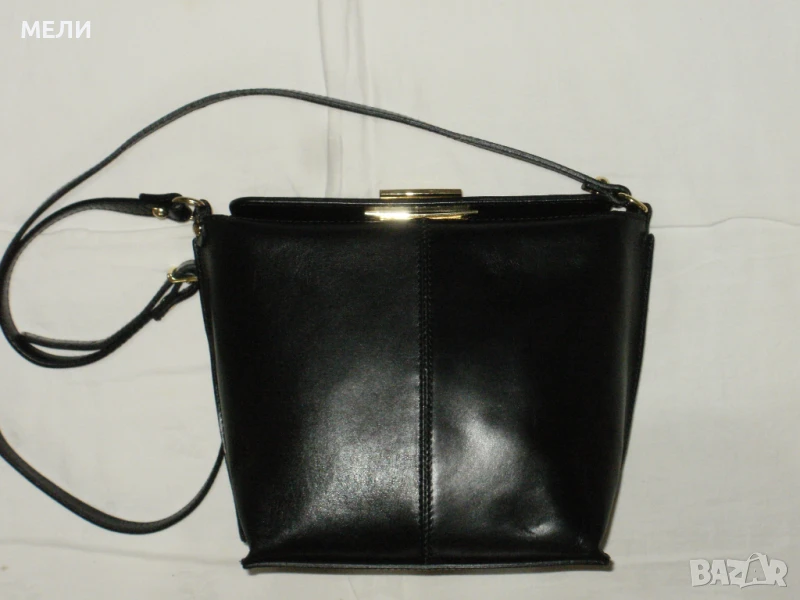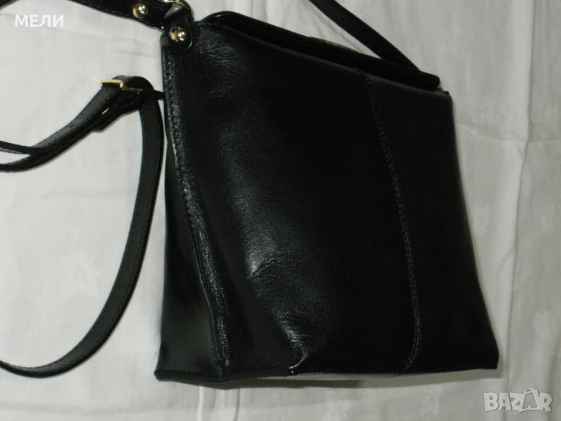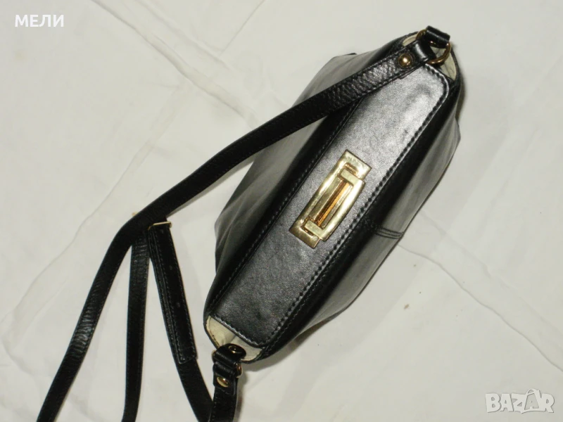 Втората чанта е нова от естествена кожа, черна със златен обков. Вътре е едно отделение с два малки джоба встрани. Външно отпред има джоб. Отгоре са закопчава с цип, има форма. Има дълга дръжка която се регулира с катарама. Цена-80лв.