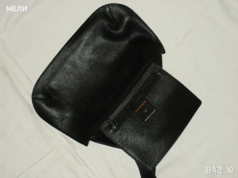 Третата чанта е нова от стабилна естествена кожа, черна. Формата е като плик но има релеф, вижда се на снимките. Вътре е едно отделение с малък джоб встрани. Отгоре са закопчава с цип. Има дръжка, носи се на рамо.