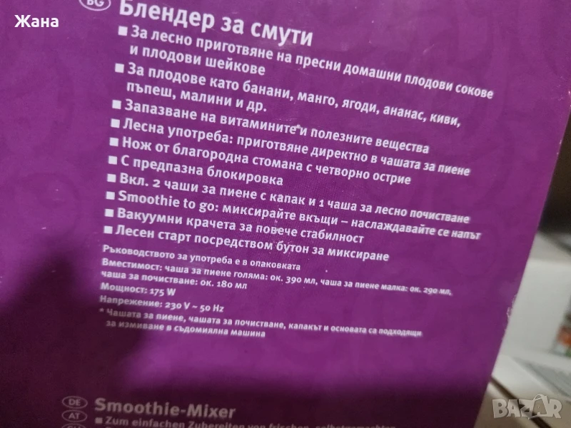 Блендер за смути, снимка 1 - Кухненски роботи - 51076223 Блендер за смути, снимка 2 - Кухненски роботи - 51076223 Блендер за смути, снимка 3 - Кухненски роботи - 51076223 Блендер за смути, снимка 4 - Кухненски роботи - 51076223 1/4