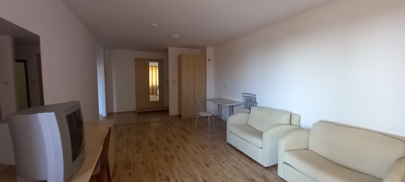Разпределение: Входно антре, дневна с трапезария и спалня, балкон и баня с тоалет.