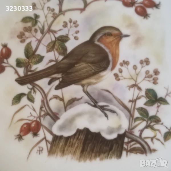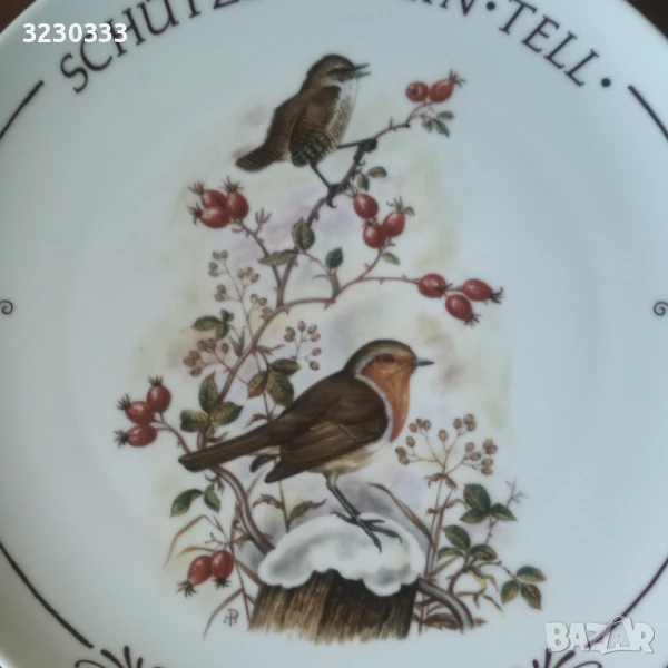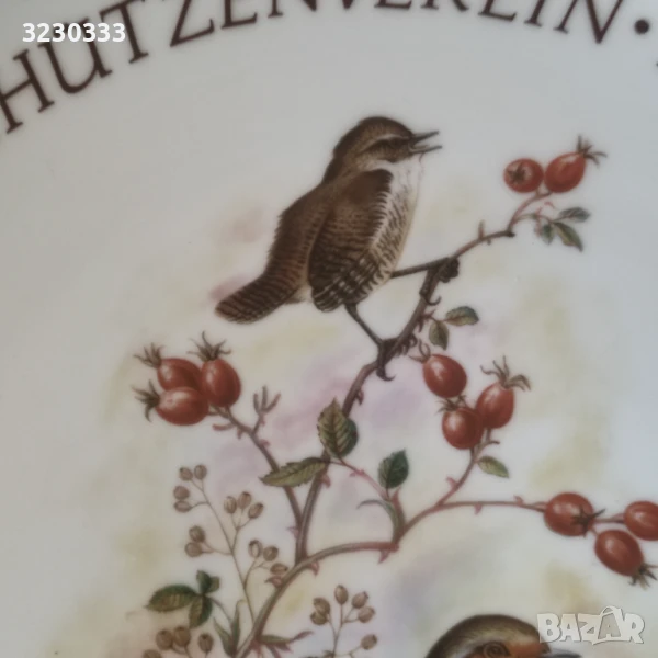 Винтидж чиния за стена от костен порцелан, изобразяваща червеношийка и орехче в снега, с шипков плод и листа - Германия, отлична, без следи от употреба, маркирана, диаметър-25 см. По Еконт с 10% отстъпка.