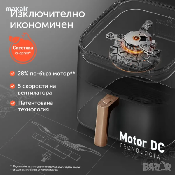 Благодарение на мотора работещ с постоянен ток, ефективността на Cosori TurboBlaze™ значително превъзхожда тази на стандартните фритюрници с горещ въздух, работещи с мотори на променлив ток. С TurboBlaze™ пестите енергия и време.