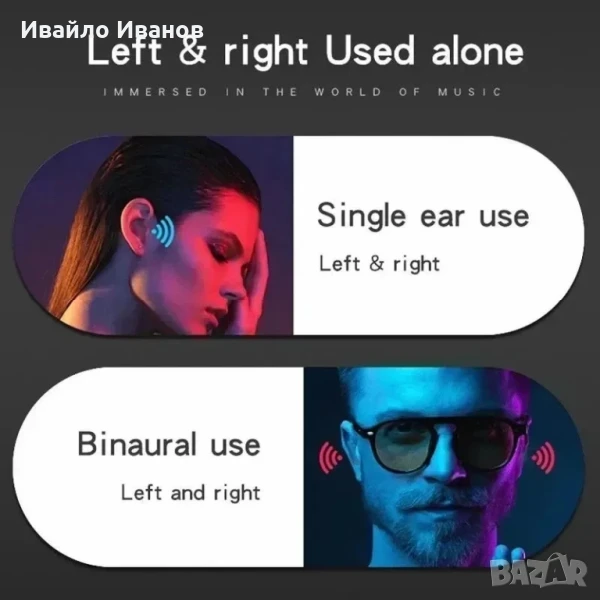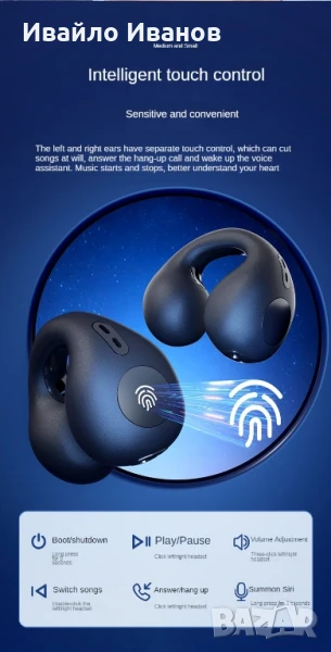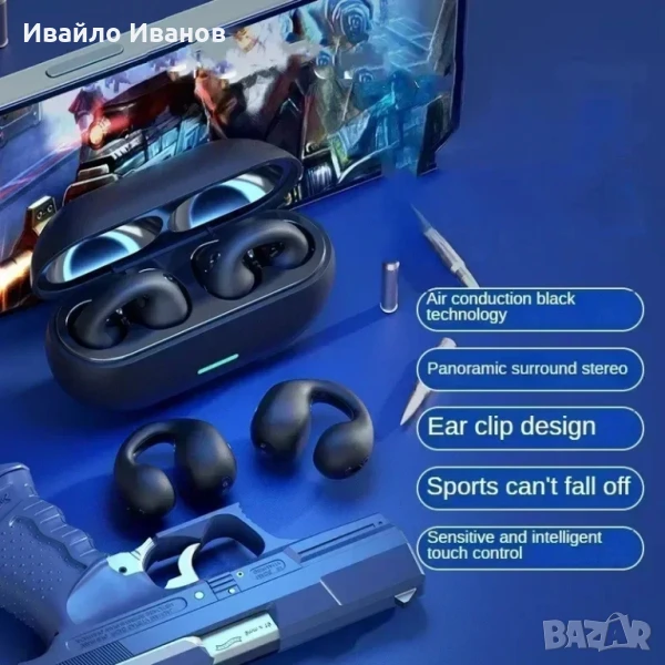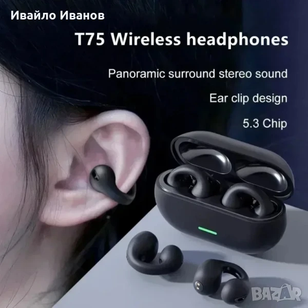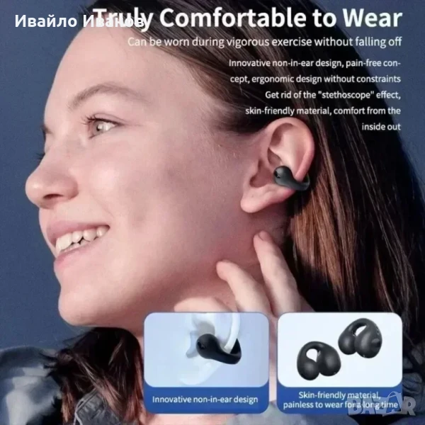 Безжична Bluetooth слушалка с клипс, продукт с креативен дизайн. Дизайнът на щипката за уши го прави лесен за закрепване към ушите, осигурявайки стабилно и удобно носене, без плътно запушване на ушите.Bluetooth