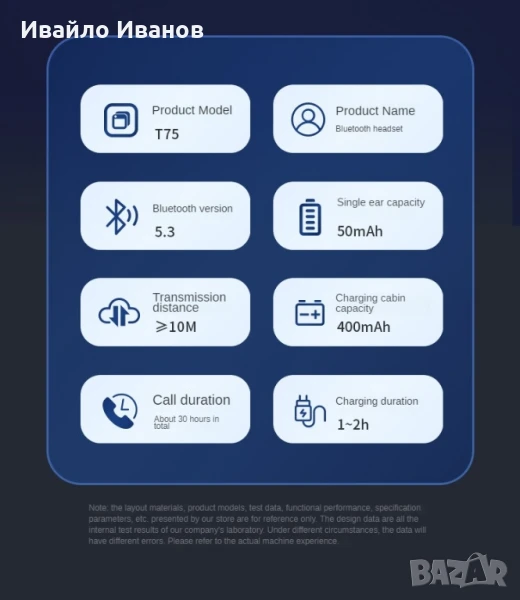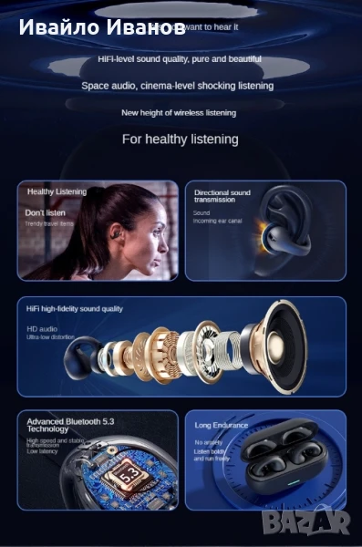 слушалките приемат протокола Bluetooth 5.0 с обхват на предаване до 15 метра, което ви позволява да се движите свободно в определен диапазон, без ограниченията на кабелите. Слушалките са водоустойчиви, отговарящи на стандарта IPX4, което означава, че издържат на пот и леки пръски вода, което ги прави подходящи за спорт и употреба на открито. Освен това има функция за повикване, приема гласов контрол и може да се използва за възпроизвеждане на музика. Имайки стерео дизайн от две части, слушалките предлагат по-богато аудио изживяване. Калъфът е изработен от силиконов материал, който е мек и издръжлив. По отношение на живота на батерията, слушалките предлагат около 3~5 часа възпроизвеждане, отговаряйки на нуждите за ежедневна употреба. Времето и методите за зареждане може да варират в зависимост от конкретния продукт, така че се препоръчва да се консултирате с ръководството на продукта за подробна информация. Накратко, тези безжични Bluetooth слушалки с клипс се отличават с креативен дизайн, водоустойчивост и множество практични функции. Подходящ е за различни сценарии, включително спорт, разговори и възпроизвеждане на музика. Независимо дали за дейности на открито или за ежедневна употреба, той предлага удобно и комфортно аудио изживяване.