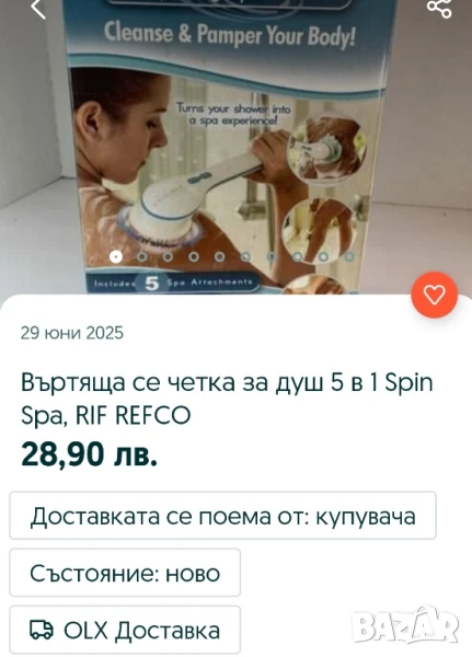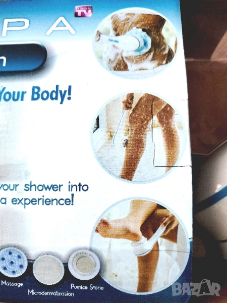 Четка за баня с масажен ефект включваща 5 приставки Spin Spa Въртяща се четка за баня Ако търсите удоволствие от вземането на душ, както и нещо по-различно и релаксиращо за Вашето тяло по време на баня. Четка за баня Spin Spa, която има функцията на въртящ се масажор едно удоволстив, което заслужава да подарите на тялото си след дълъг работен ден. Релаксиращото действие на този уред се дължи на вибриращите му движения, които подобряват кръвообръщението на тялото и изхвърлят излишните мъртви клетки от кожата Ви. Spin Spa се захранва с 3бр. АА батерии, които не са включени в комплекта и има две скорости (бърза и бавна). Благодарение на въртящата се и удобна и дълга дръжка четката Spin Spa достига до всяка част от Вашето тяло! За района на Благоевград,може и лично предаване...