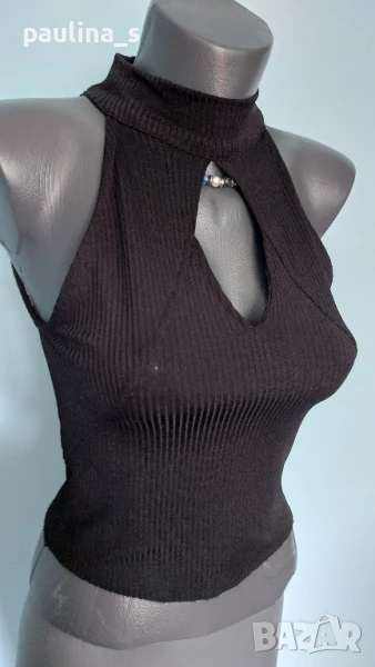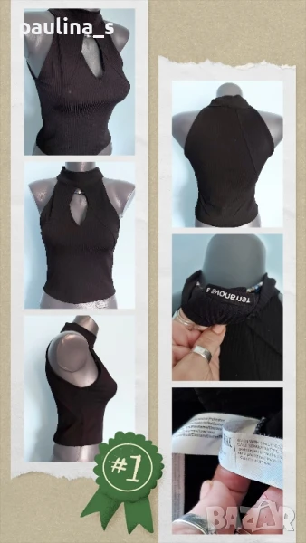 1️⃣. Колаж / S / XL - "Terranova". Цената е крайна 14,99лв / 7,5 евро. Марков рипсен топ или бюстие от еластична ликра, много еластична материя, покрива няколко размера, посочени са. Моделът е много интересен, цвят Черен. Една бройка е, без дефекти и етикет, като ново.