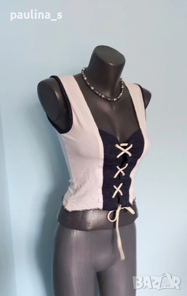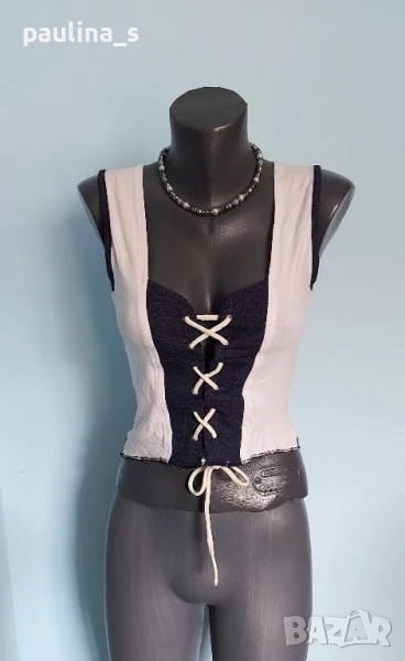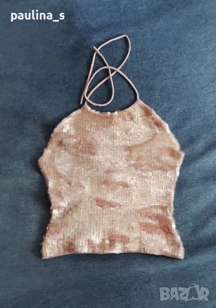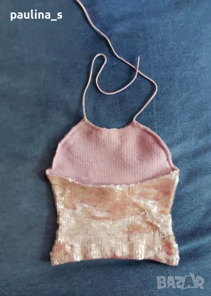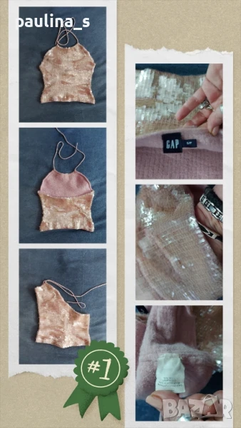 5️⃣. Колаж / XS / S - "Gap". Цената е крайна 19,99лв / 10 евро. Пайетено бюстие с отворен гръб. Материята отвътре е 100% вълна, декорации с квадратни прозрачни пайети. Дрехата е много красива, блести от различния наклон на пайетите. Гръдната обиколка не се фиксира, платката е свободна и се завързва около врата. Малък размер, не е ново, но е без дефекти. Уникално!