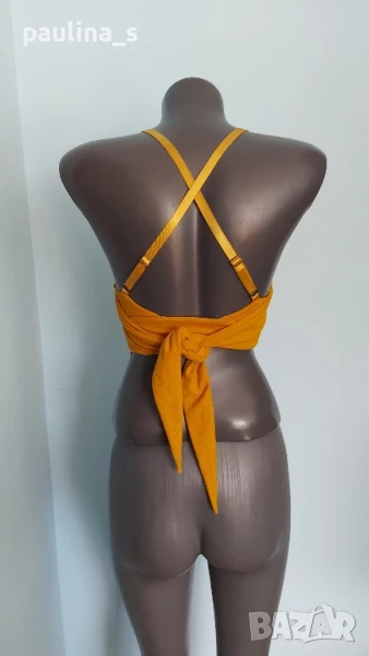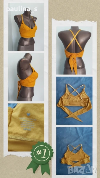 4️⃣. Колаж / XS / M - "❤️Love fitness". Цената е крайна 19,99лв / 10 евро. Много интересно мрково бюстие за бански или фитнес от рипсена ликра. Цветът е Горчица, чисто ново, никога не е ползвано, без дефекти и етикет. Презрамките се регулират индивидуално и са прекръстосано. Малък размер, може да се носи и от девойки.