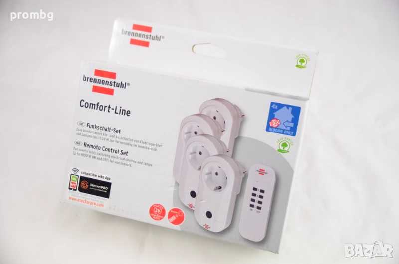 контакти с дистанционно управление, т Германия, 4 + 1, BRENNENSTUHL RC CE1 4001, бял цвят. Контактите се използват за включване и изключване от разстояние, настройва се за всеки един от контактите. Безотказен поради използването на над 65 000 различни кода. Постоянно съхранение на кодирането дори в случай на по-дълго прекъсване на захранването. Клас на защита IP20. Размери 20 см x 6,5 см х 13 см.