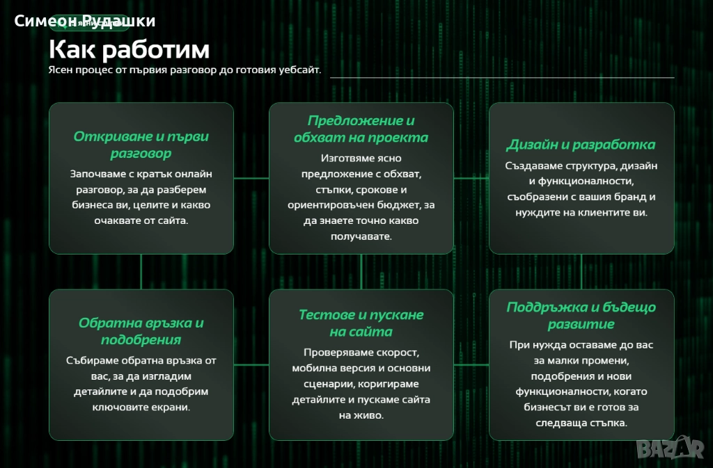 Важно е да отбележа, че не използваме готови платформи за изграждане на уебсайтове. Всичко, което създаваме, е ръчно изработено за максимална прецизност и оптимизация, без да зависи от трети страни.