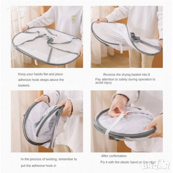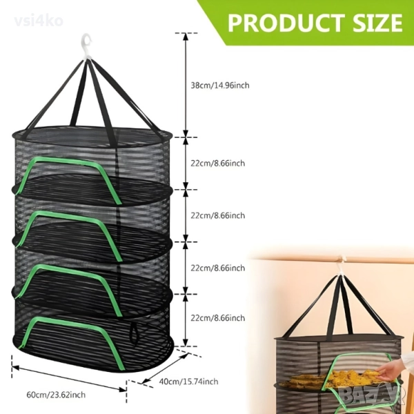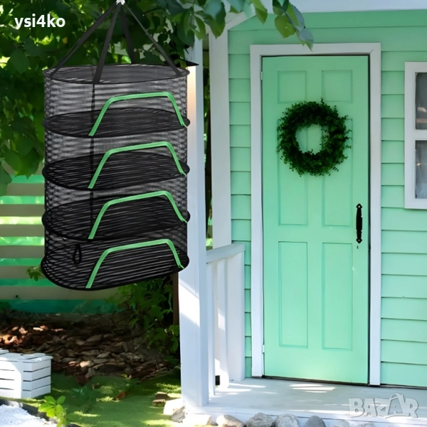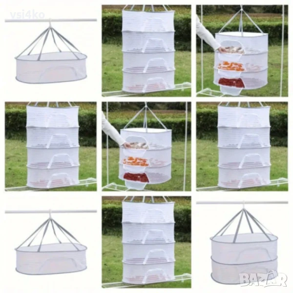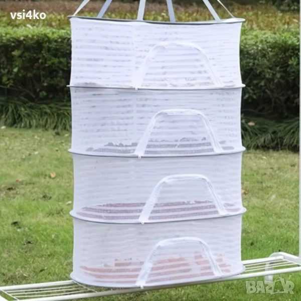Практична и компактна сушилня с 4 отделения, изработена от дишаща мрежа, която предпазва от прах, насекоми и замърсявания. Подходяща за сушене на плодове, зеленчуци, гъби, билки, цветя и дори пране на открито.