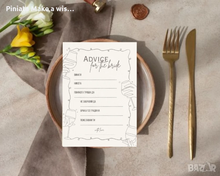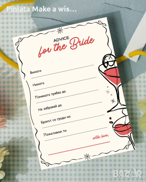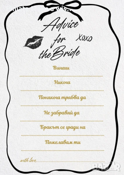 Може да се комбинира с табелка "Напиши нещо за булката", книга за пожелания или фотокът