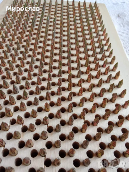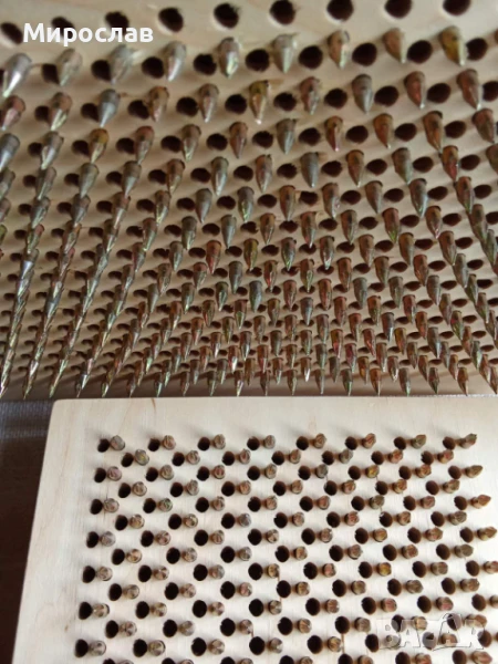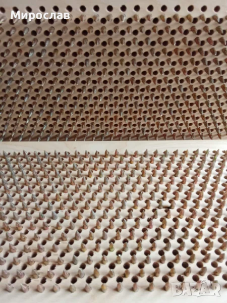 Брой на пироните - 930бр. Тези пирони са с една идея по-остри от поцинкованите, затова направих за начинаещи през 9мм. разстояние, подредени в схема Семето на Живота(шестограм) .