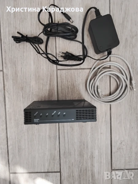 Кабелен модем за интернет с два порта. Има и свързващи кабел и адаптор към модема. Също така диск с упътване.