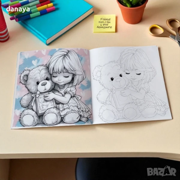 Заглавието „Hug time Coloring“ съчетава усещането за нежност и топлина с радостта от оцветяването – истинско удоволствие за малките любители на животни, прегръдки и забавления с цветове. Подходяща за креативни игри у дома или в училище.