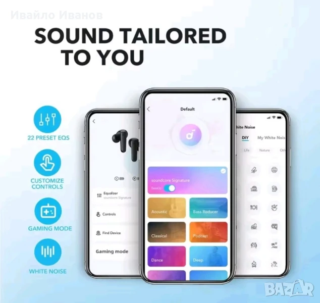 22 предварително зададени EQ, персонализиране чрез приложение.