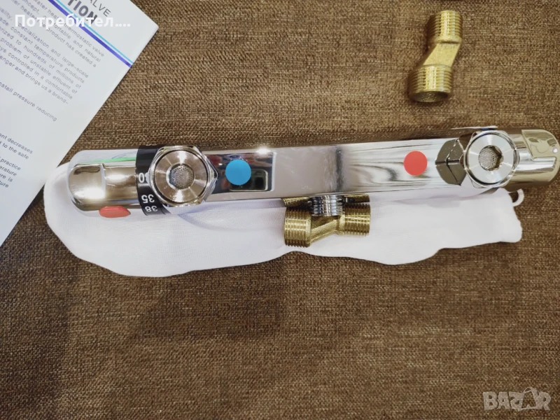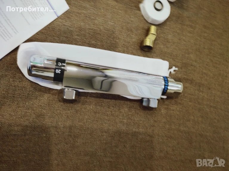 Чисто нов смесител с термоглава. В кутията си има всички приспособления за монтаж. Вижда се на снимката. Чучура е отдолу, оказа се, че не ми върши работа, трябва отгоре.