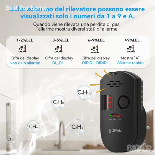 детектор CHZHVAN, детектор за течове на пропан-бутан/природен газ/въглища, монитор за метан и пропан-бутан с включване в контакта, звукова аларма и LED цифров дисплей за кухня, мобилен дом, гараж.
