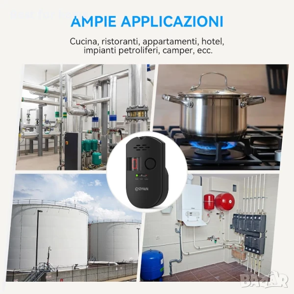 Детектор за множество газове - Детекторът за газове се използва главно за откриване на природен газ (основни компоненти: метан), пропан-бутан (основни компоненти: пропан, бутан) и градски въглищен газ (алкан, олефин, арен). Той излъчва алармен сигнал и мига с червена светлина, когато концентрацията надвиши 3% LEL. Широко използван в ресторанти, кухни, болници, хотели, петролни заводи, гаражи, бензиностанции и др.
