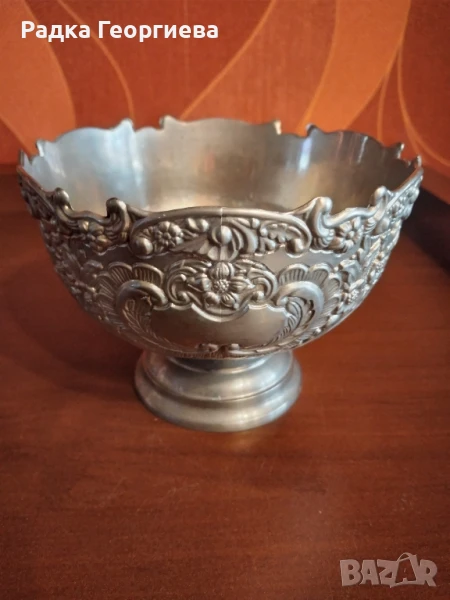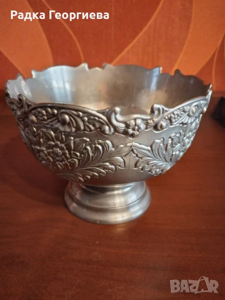 Посребрена италианска купа от 50 - 60те г. на миналия век. Висока - 9см. Ширина при отвора 12.5см. Богато украсена с релефни цветя.