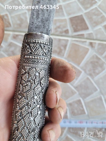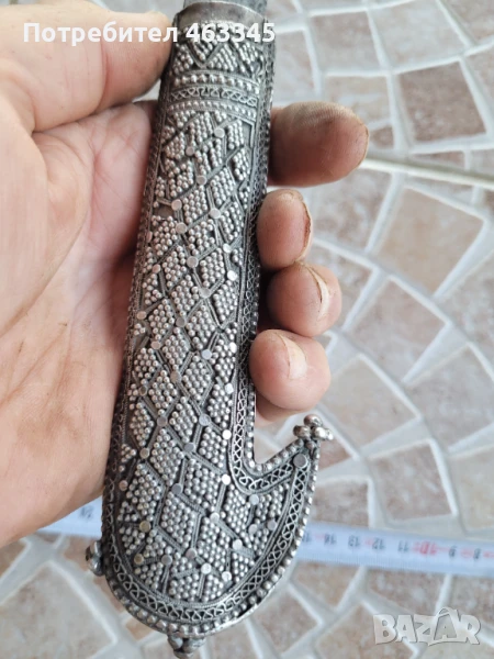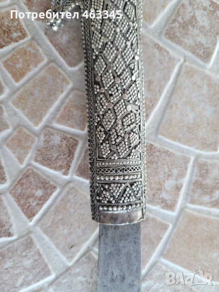 Изключително рядък нож за нашите земи - йеменска шафра от 19-ти век. Ножът е с дръжка от сребро, украсен от едната страна с гранулация. От другата срана, дръжката е неукрасена. Остреието е типично за тоя нож, без ръжда, непочиствано. За съжаление е без ножна